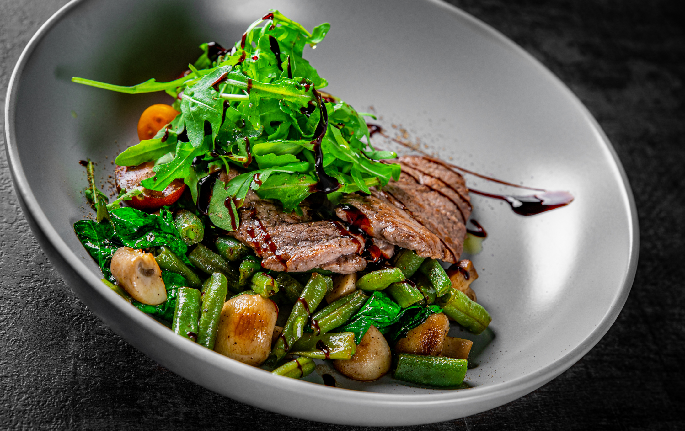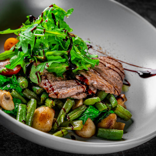 Steak Salad with Carmelized Balsamic Onions, Sauteed Mushroom with Grainy Mustard Vinaigrette