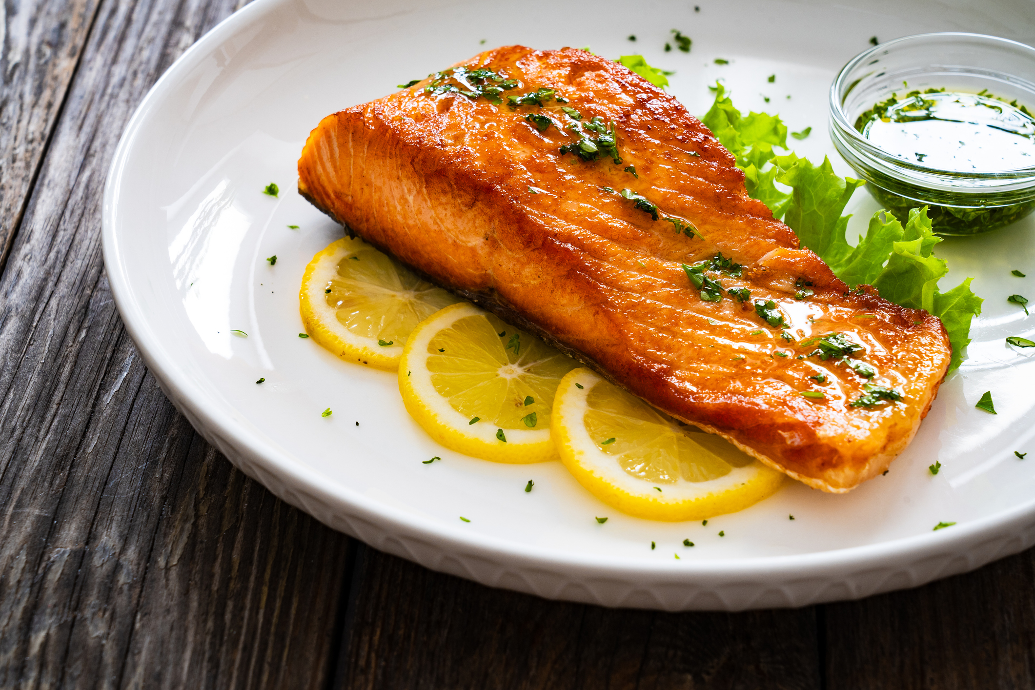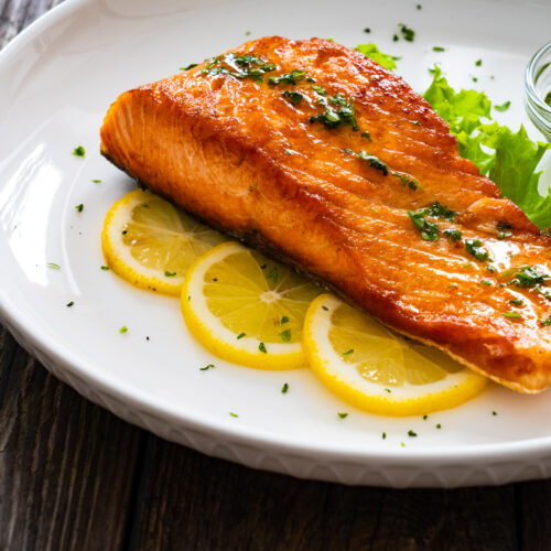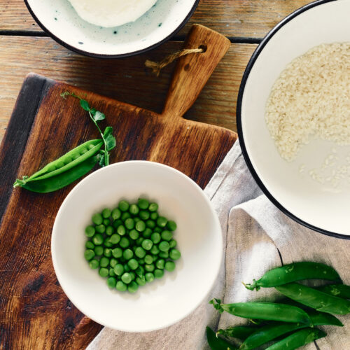 Balsamic Honey Glazed Salmon with Spring Pea Risotto, Grilled Asparagus and Glazed Carrots